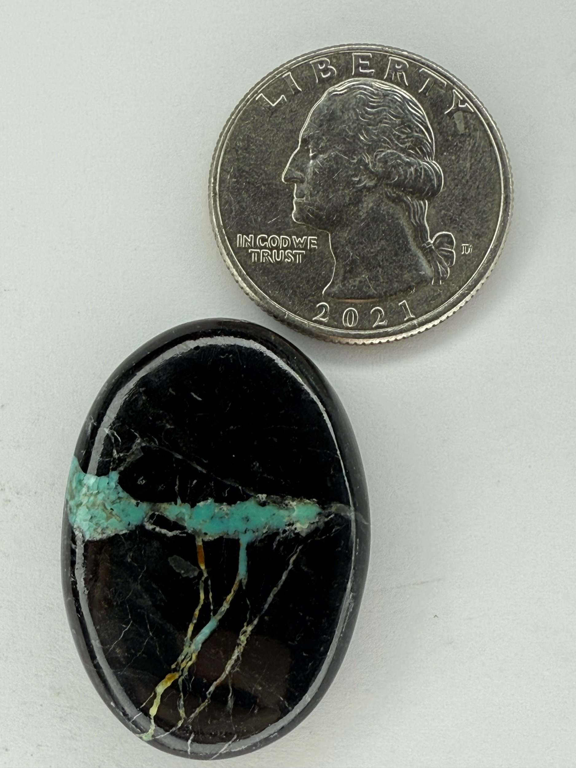 Shop › Blackjack Turquoise TC#468 Image 1 of 2 Image 2 of 2 Blackjack Turquoise TC#468 $110.00 Stabilized Blackjack Turquoise cabochon. Backed with black epoxy and ready to be set in jewelry. Weight 39 carats. Add To Cart Added! Stabilized Blackjack Turquoise cabochon. Backed with black epoxy and ready to be set in jewelry. Weight 39 carats.