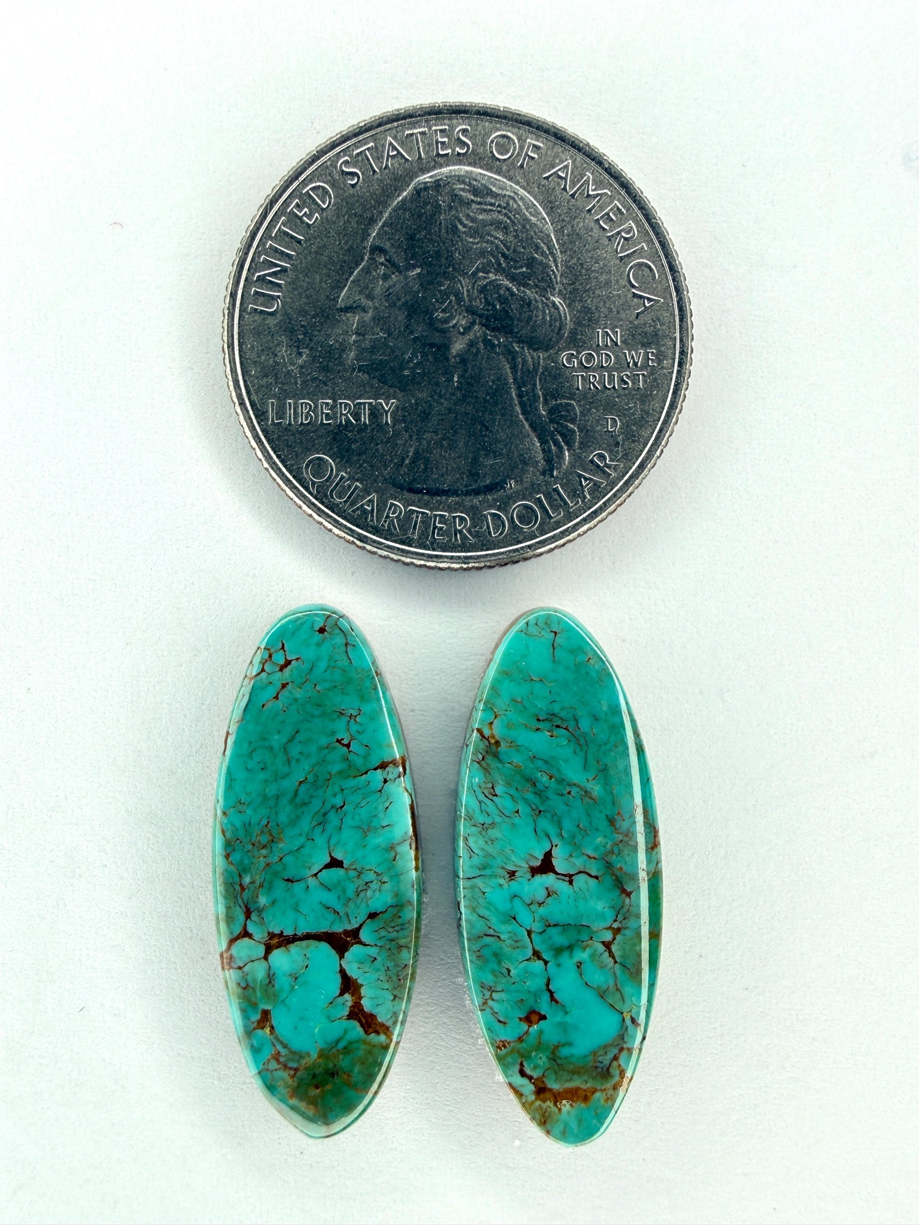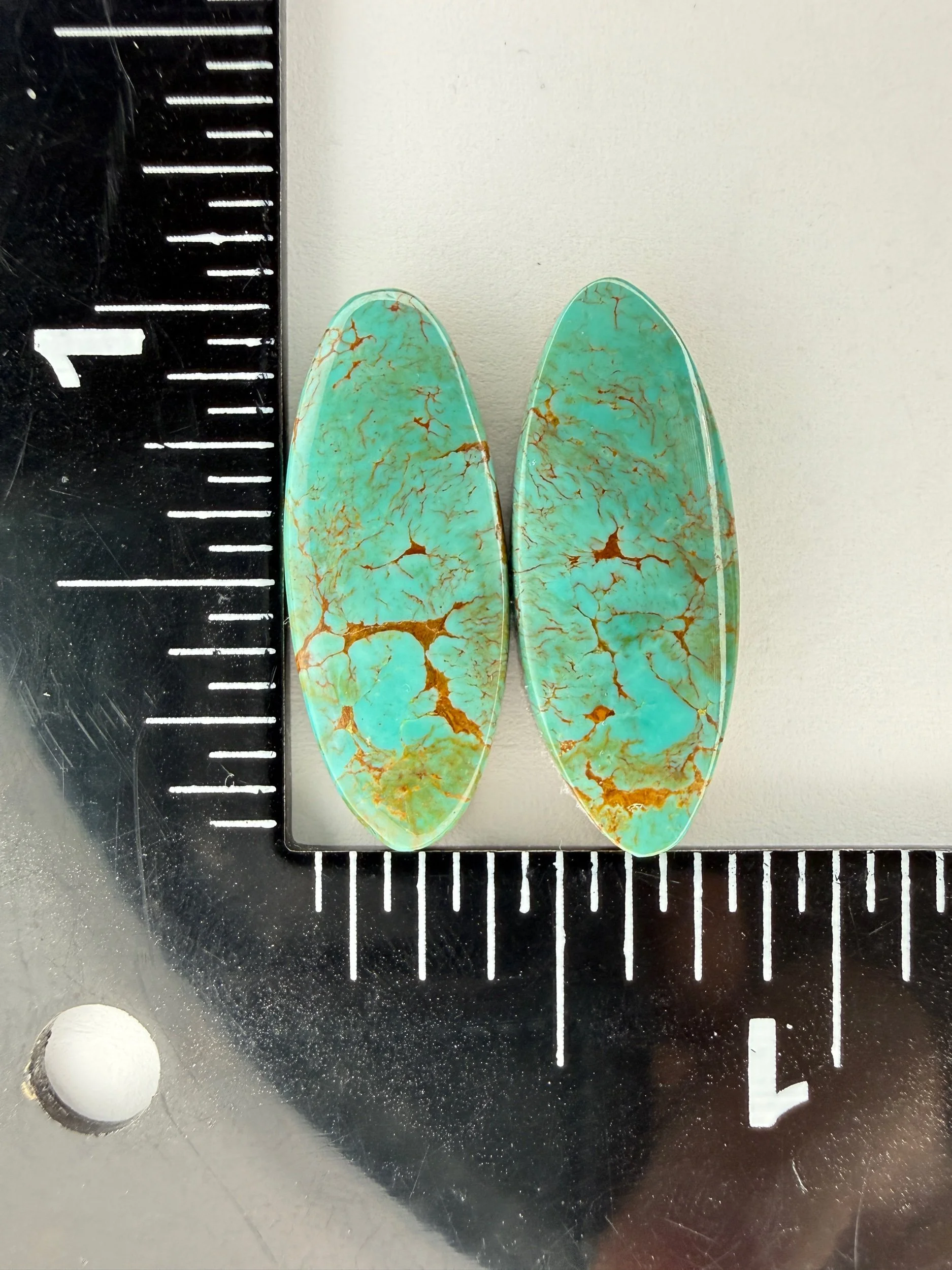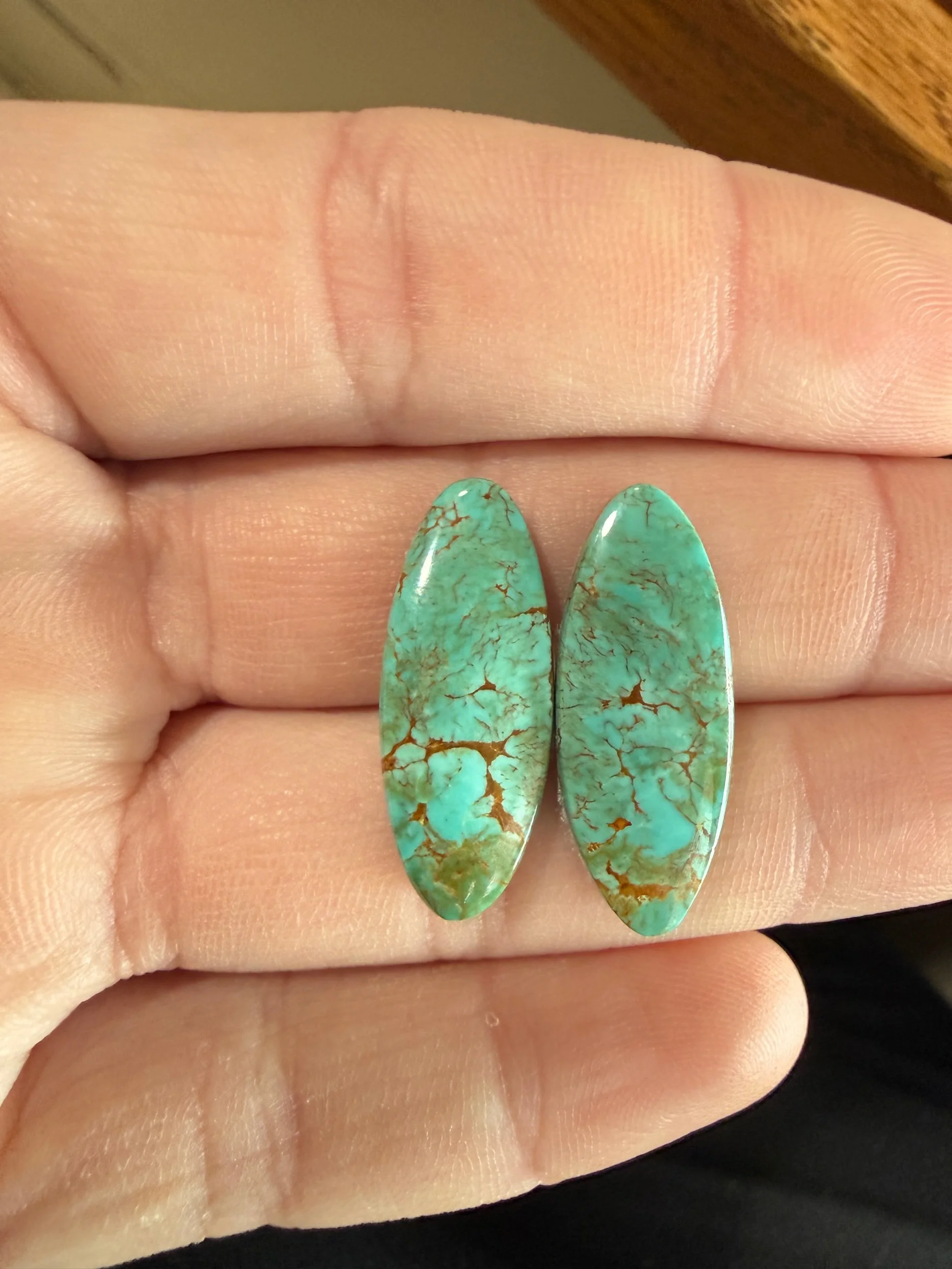 Shop › Chilean Turquoise TC#25 Image 1 of 3 Image 2 of 3 Image 3 of 3 Chilean Turquoise TC#25 $30.00 Stabilized Chilean turquoise cabochon pair. Backed with epoxy and ready to be set in jewelry. Weight 15 carats. Add To Cart Added! Stabilized Chilean turquoise cabochon pair. Backed with epoxy and ready to be set in jewelry. Weight 15 carats.