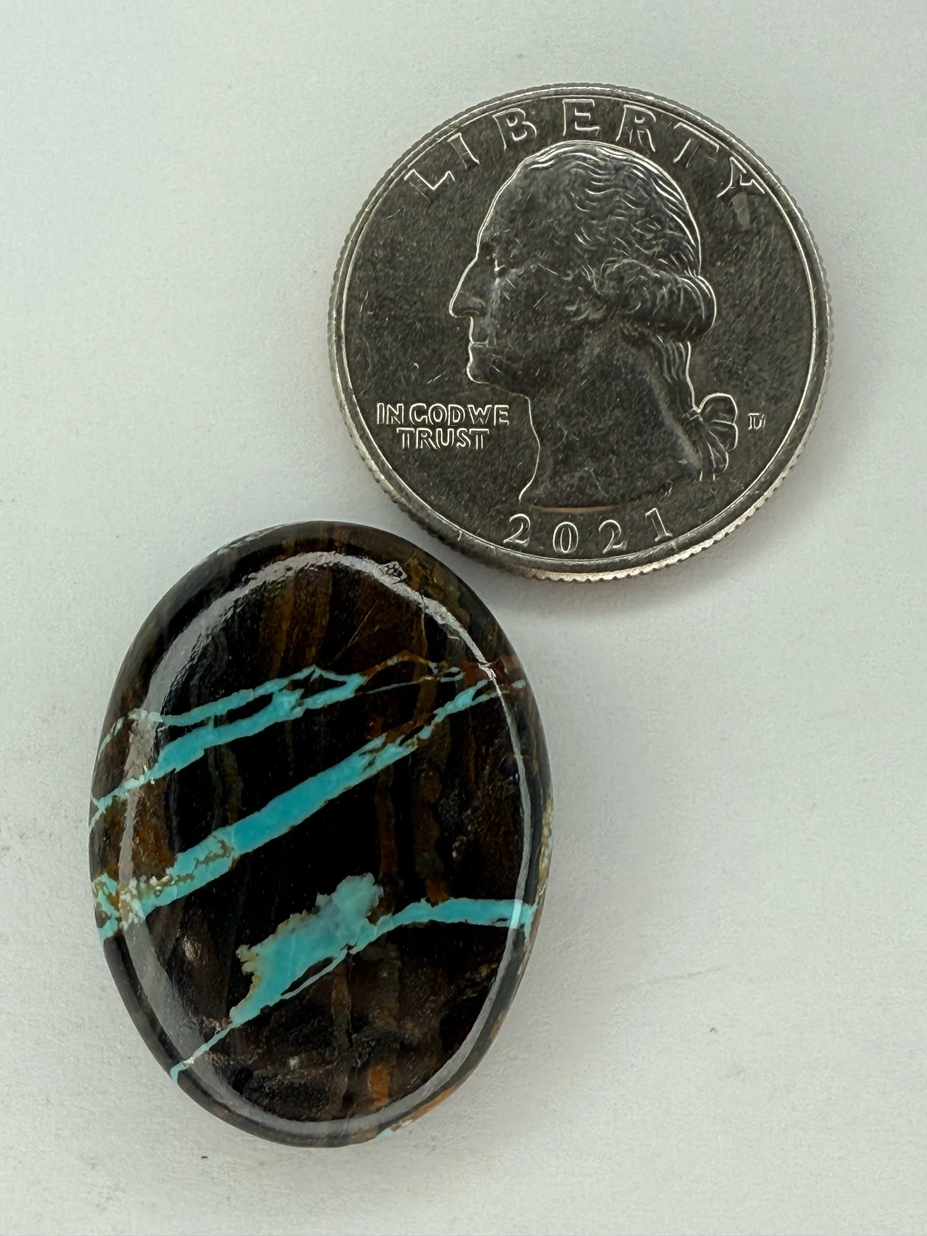 Shop › Blackjack Turquoise TC#490 Image 1 of 2 Image 2 of 2 Blackjack Turquoise TC#490 $85.00 Stabilized Blackjack Turquoise cabochon. Backed with black epoxy and ready to be set in jewelry. Weight 29 carats. Add To Cart Added! Stabilized Blackjack Turquoise cabochon. Backed with black epoxy and ready to be set in jewelry. Weight 29 carats.